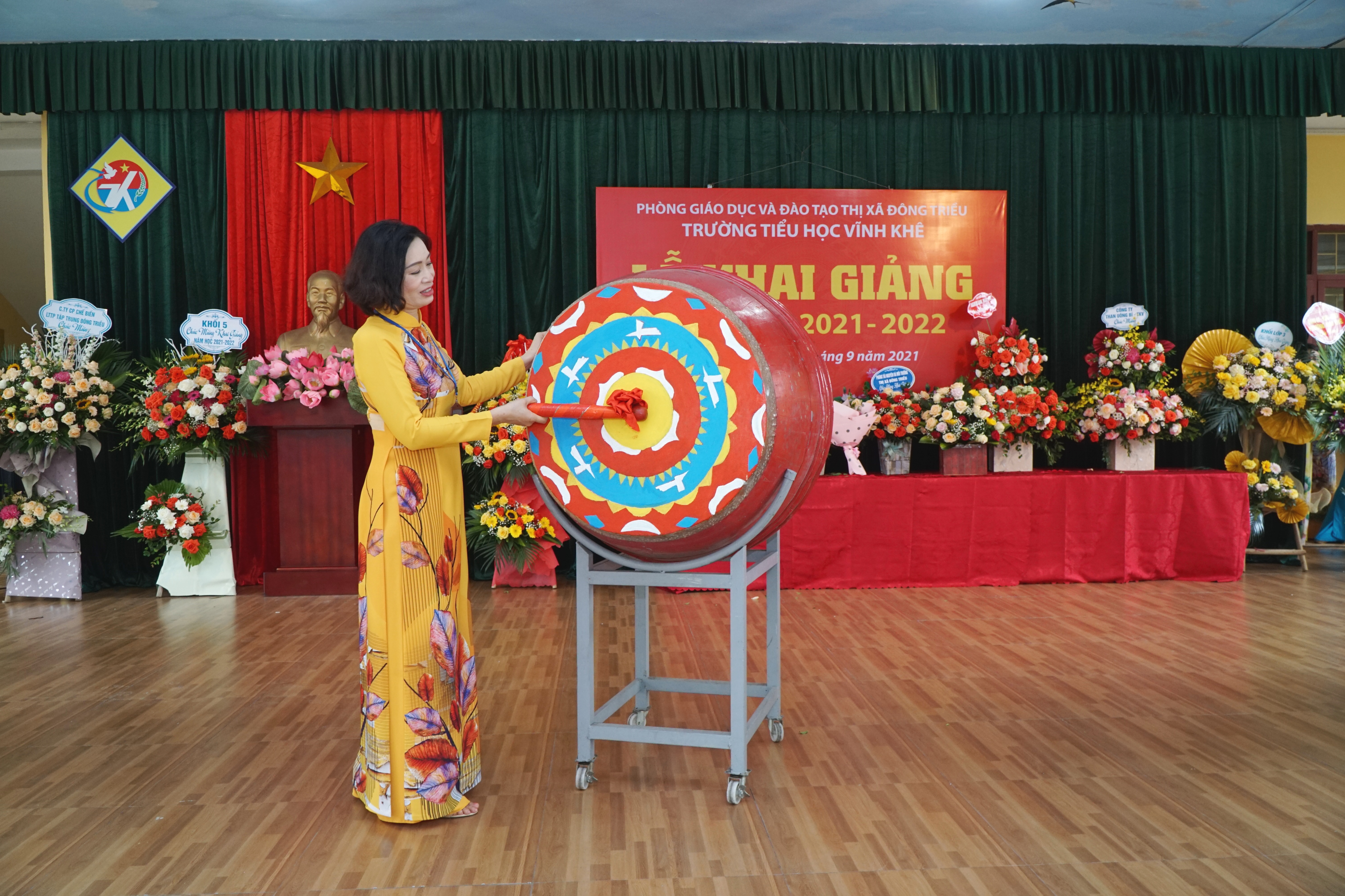 cô Phạm Thị Nguyệt - HT - đánh trống khai trường.JPG