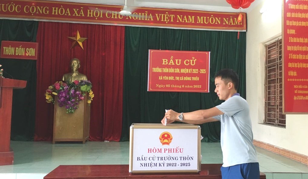 Đ/c: Hà Hồng Việt - Phó Hiệu trưởng nhà trường đang tiến hành bỏ phiếu bầu trưởng thôn tại thôn Đồn Sơn - xã Yên Đức.