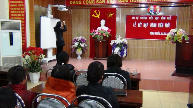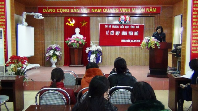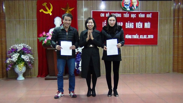 Nhân dịp kỷ niệm 85 năm ngày thành lập Đảng Cộng sản Việt Nam (03/02/1930 - 03/02/2015), chiều ngày 03/02/2015 được sự đồng ý nhất trí của Đảng bộ huyện Đông Triều – Đảng uỷ thị trấn Mạo Khê. Chi bộ trường Tiểu học Vĩnh Khê long trọng tổ chức kết nạp Đảng viên mới cho 2 đồng chí Nguyễn Trung Kiên và Hoàng Thị Vân Hạnh. Đến dự buổi lễ có đồng chí Lê Thị Thu – Bí thư chi bộ, các đồng chí trong ban chi uỷ và các đồng chí đảng viên trong chi bộ nhà trường.Qua nhiều năm phấn đấu, với mong muốn được rèn luyện, trưởng thành, đứng trong hàng ngũ của Đảng, 2 đồng chí đã luôn nỗ lực hết mình vì sự nghiệp giáo dục, được học sinh tin yêu, phụ huynh quý mến. 2 đồng chí là giáo viên dạy giỏi cấp cơ sở, cấp tỉnh nhiều năm và là một đoàn viên luôn hoàn thành xuất sắc các nhiệm vụ đựợc giao.