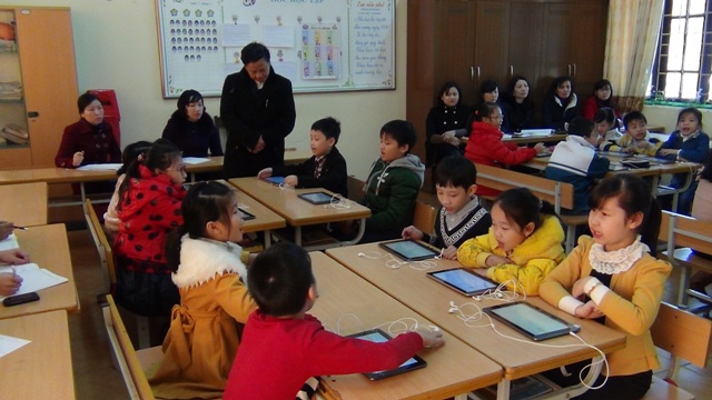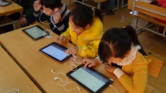 Các em học sinh đang tra cứu thôn tin trên mạng qua hệ thống máy tính bảng