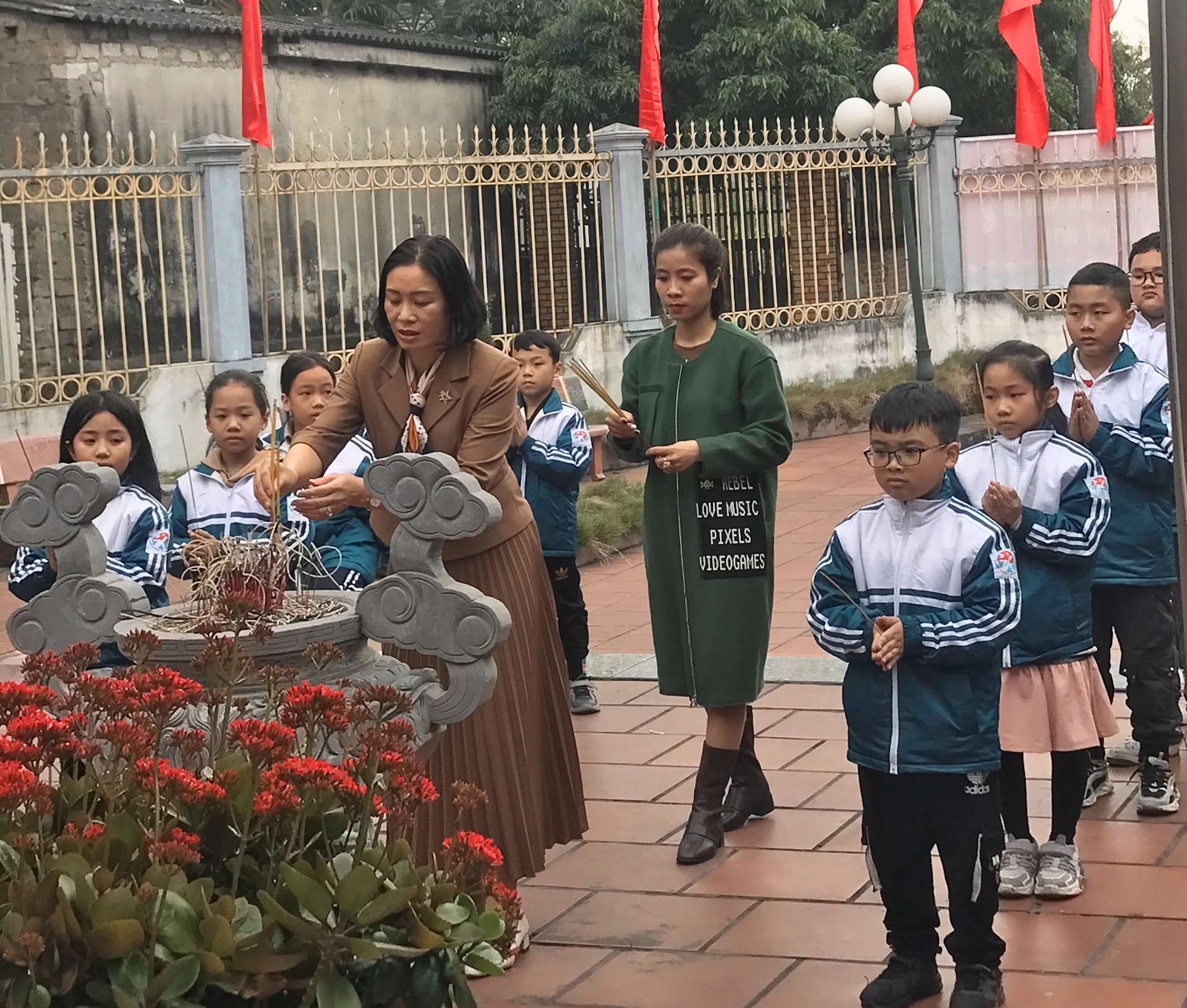 Cô Phạm Thị Nguyệt – Bí thư chi bộ - Hiệu trưởng nhà trường và thầy cô giáo, học sinh dâng hương tại khu di tích