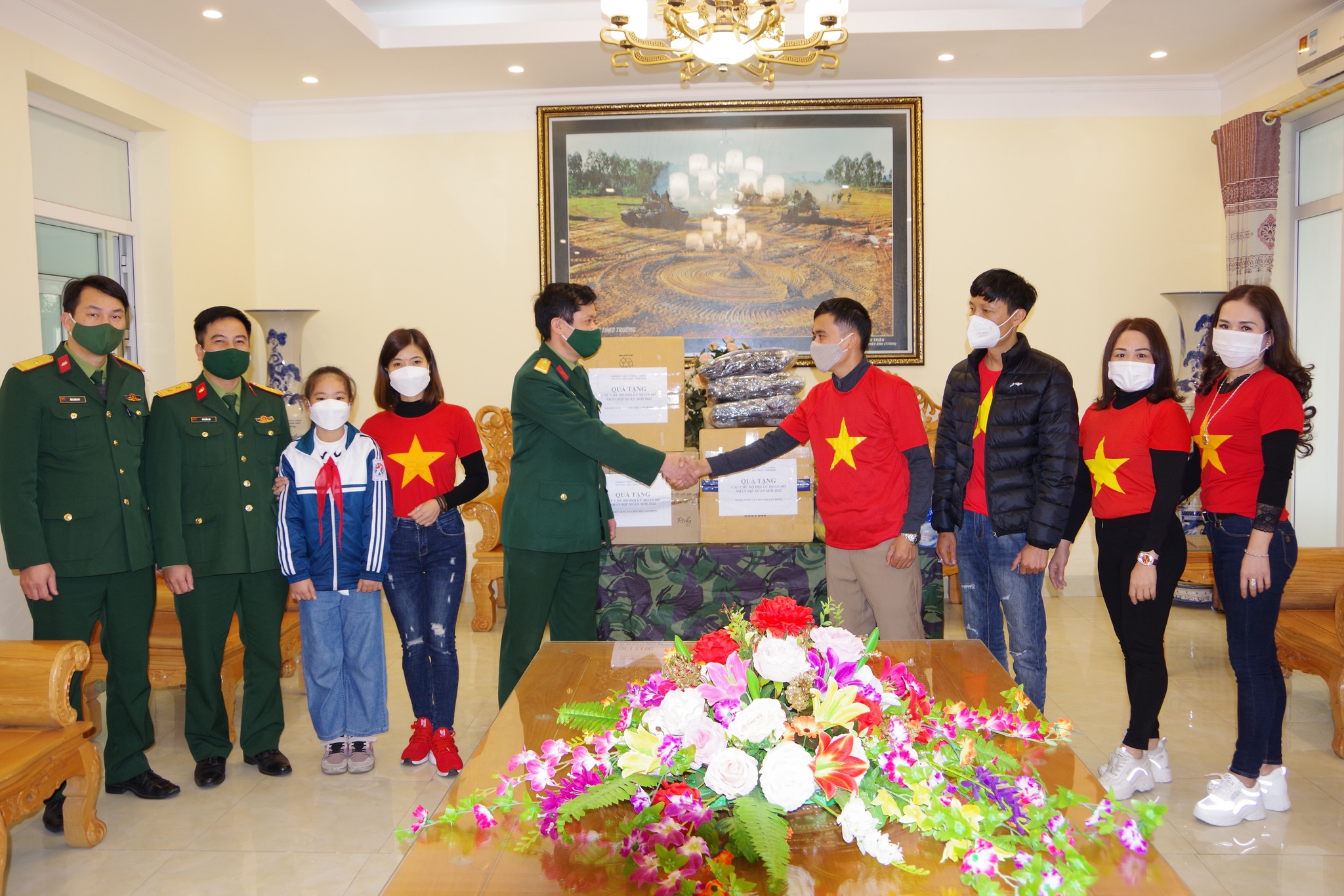 Thầy giáo Hà Hồng Việt - Phó Hiệu trường nhà trường (áo đỏ bên phải ảnh) chúc tết đơn vị Lữ đoàn 405/KQ3