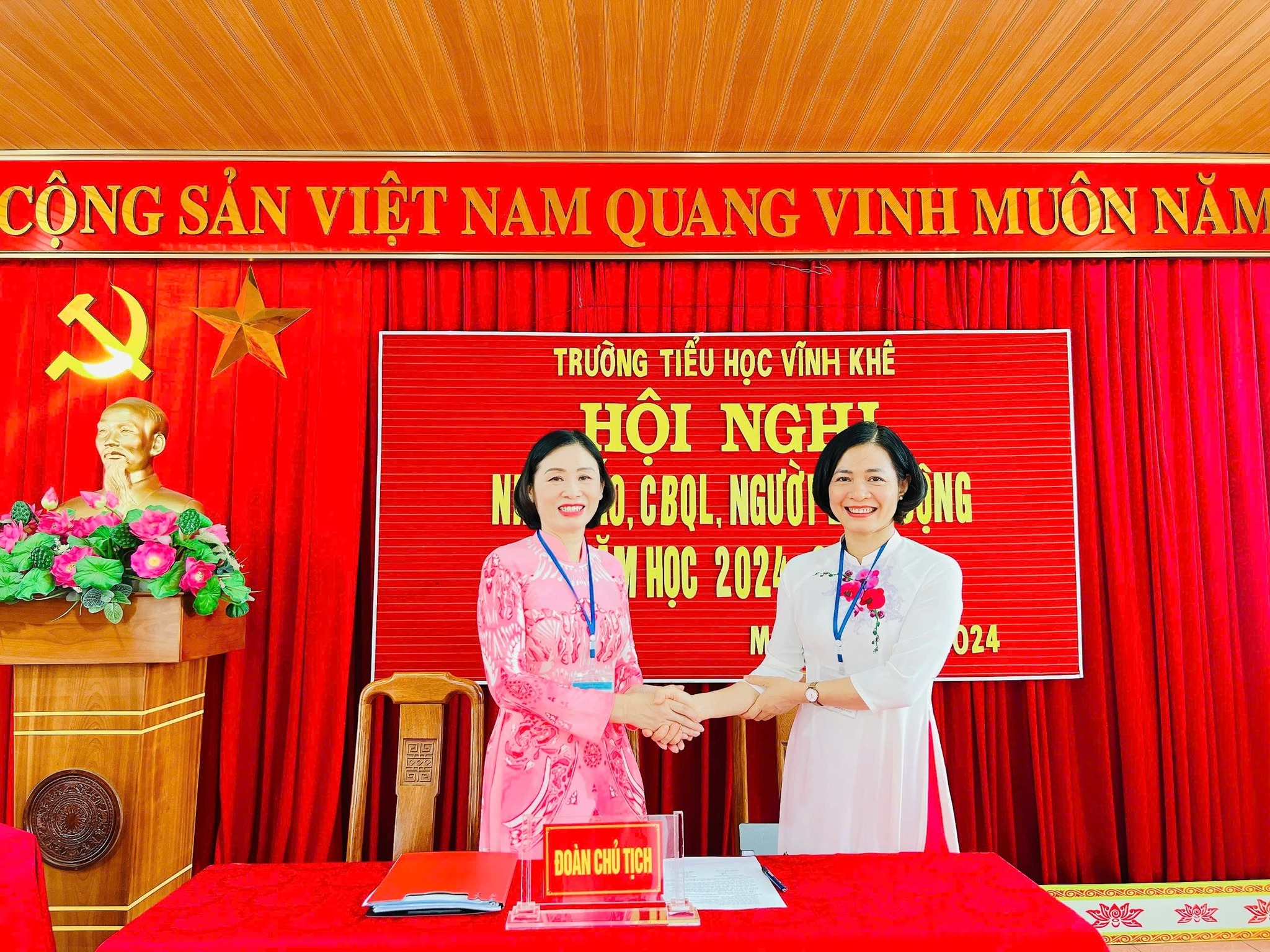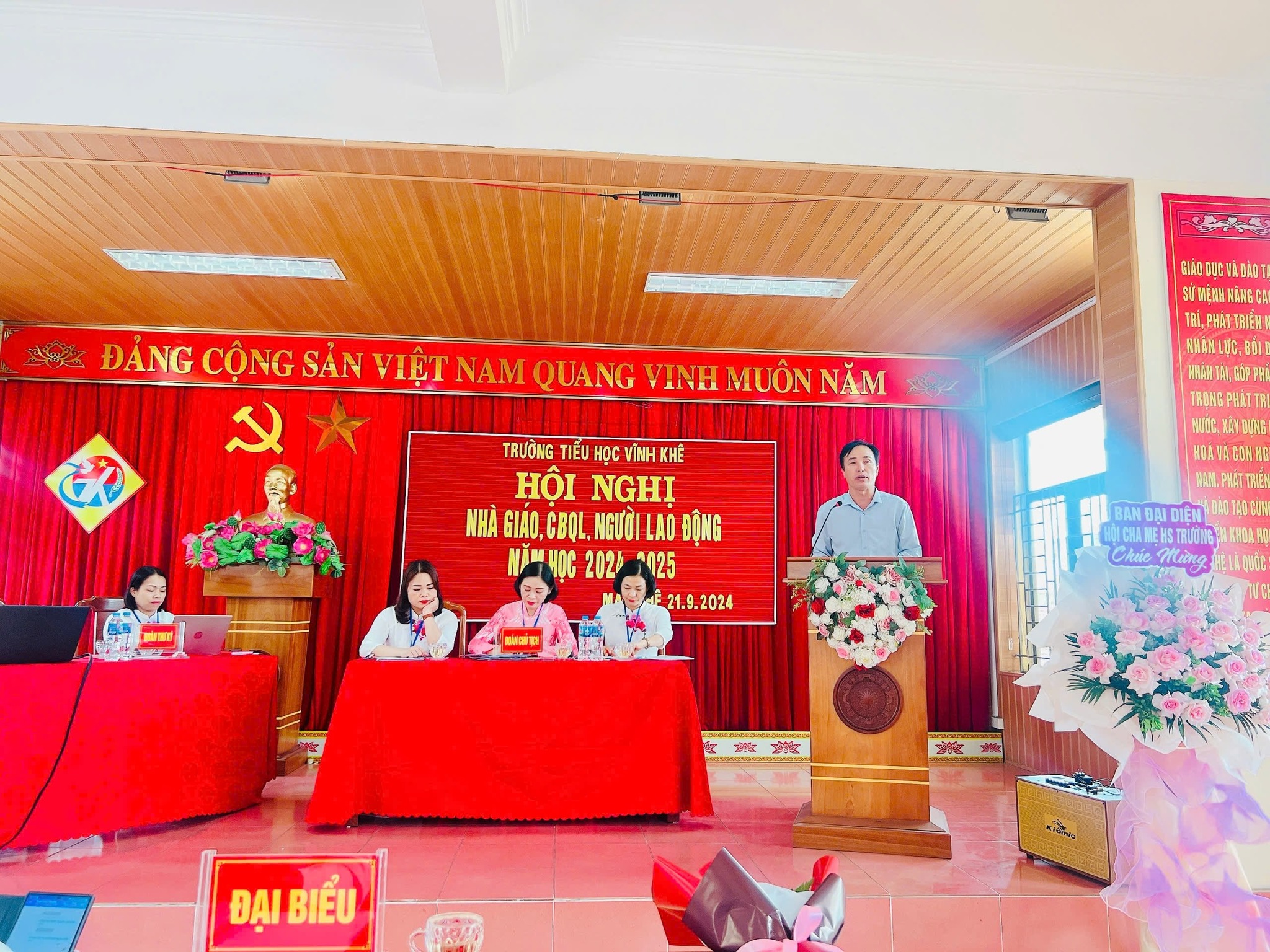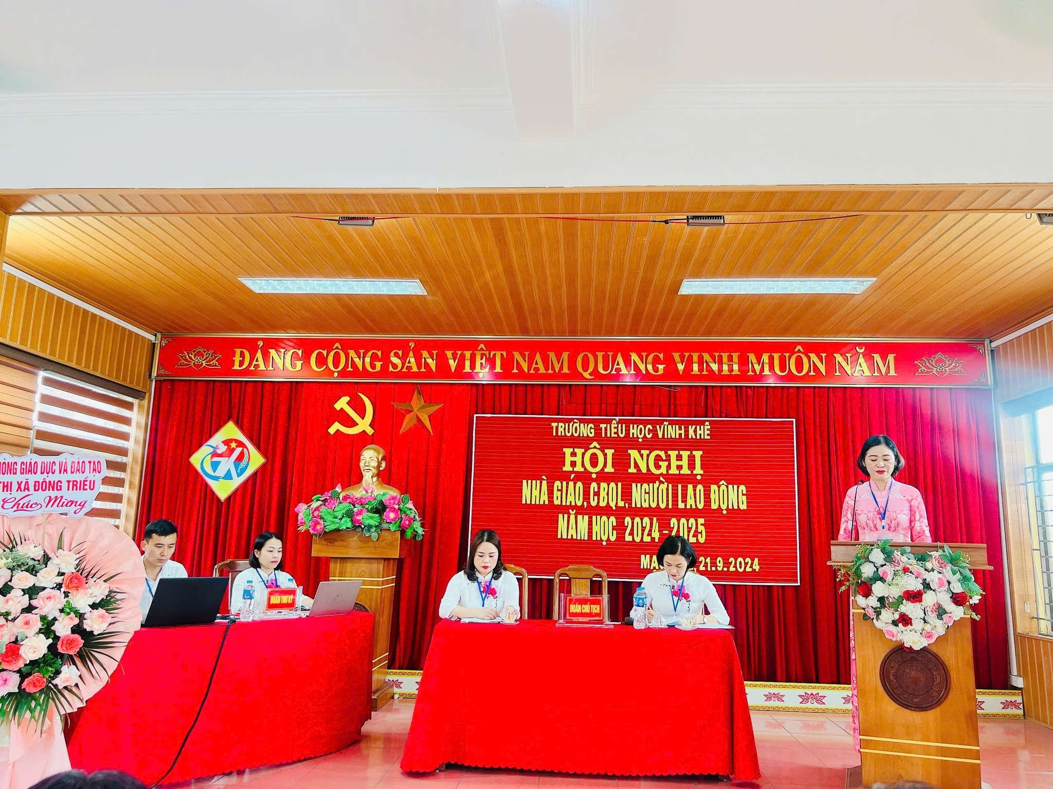 Thực hiện Công văn số 1544/HNLN-GDĐT-LĐLĐ ngày 4/9/2024 của Phòng GD&ĐT – Liên đoàn Lao động thị xã Đông Triều về việc hướng dẫn tổ chức Hội nghị nhà giáo, cán bộ quản lý, người lao động năm học 2024-2025. Sáng ngày 21/09 trường Tiểu học Vĩnh Khê tổ chức Hội nghị nhà giáo, cán bộ quản lý, người lao động năm học 2024- 2025.