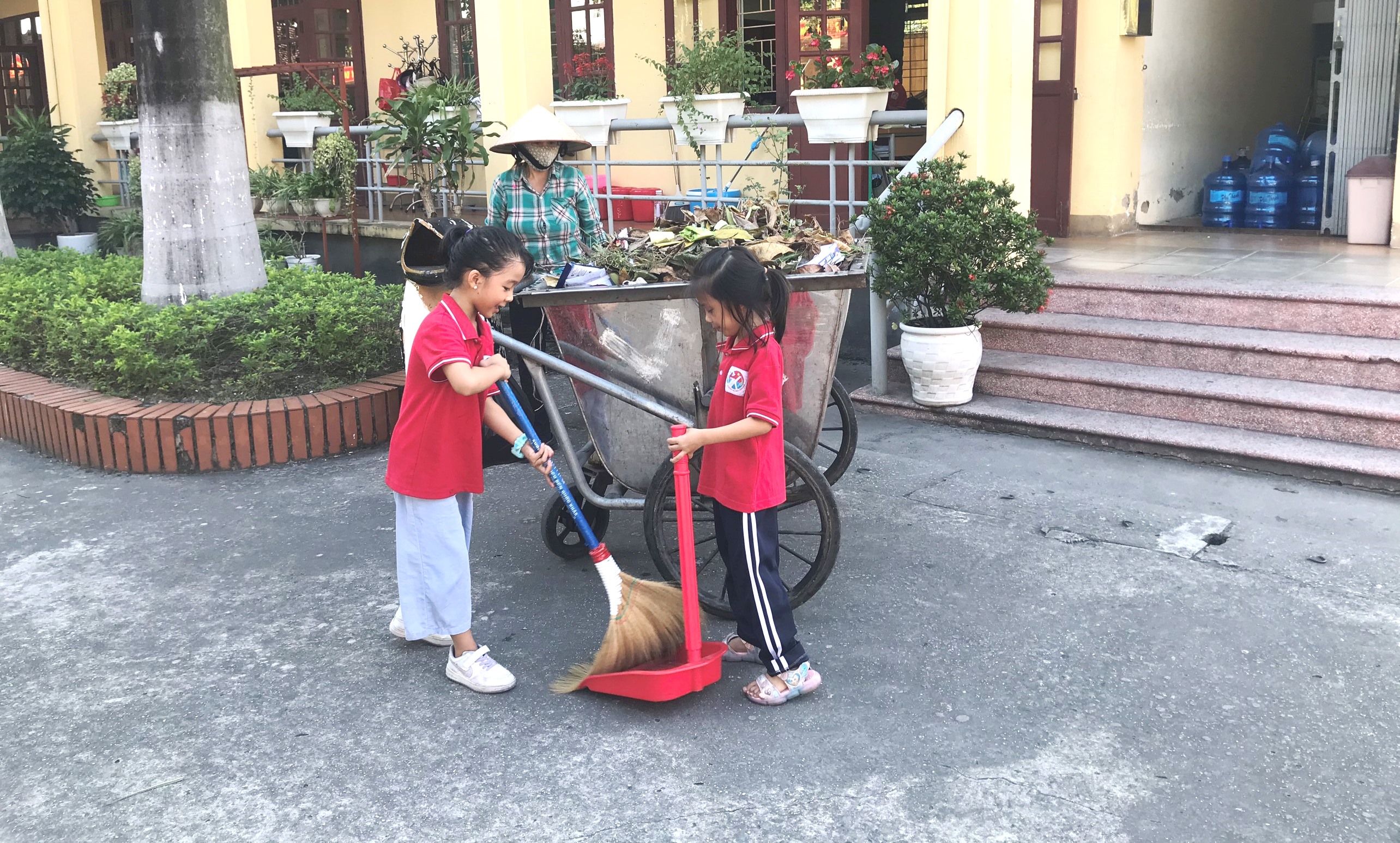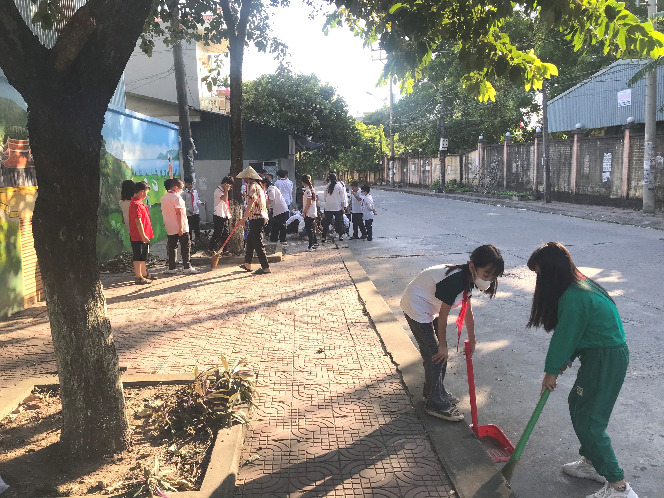 Giáo viên và học sinh lớp 5E7 tham gia tổng vệ sinh khu vực cổng trường
