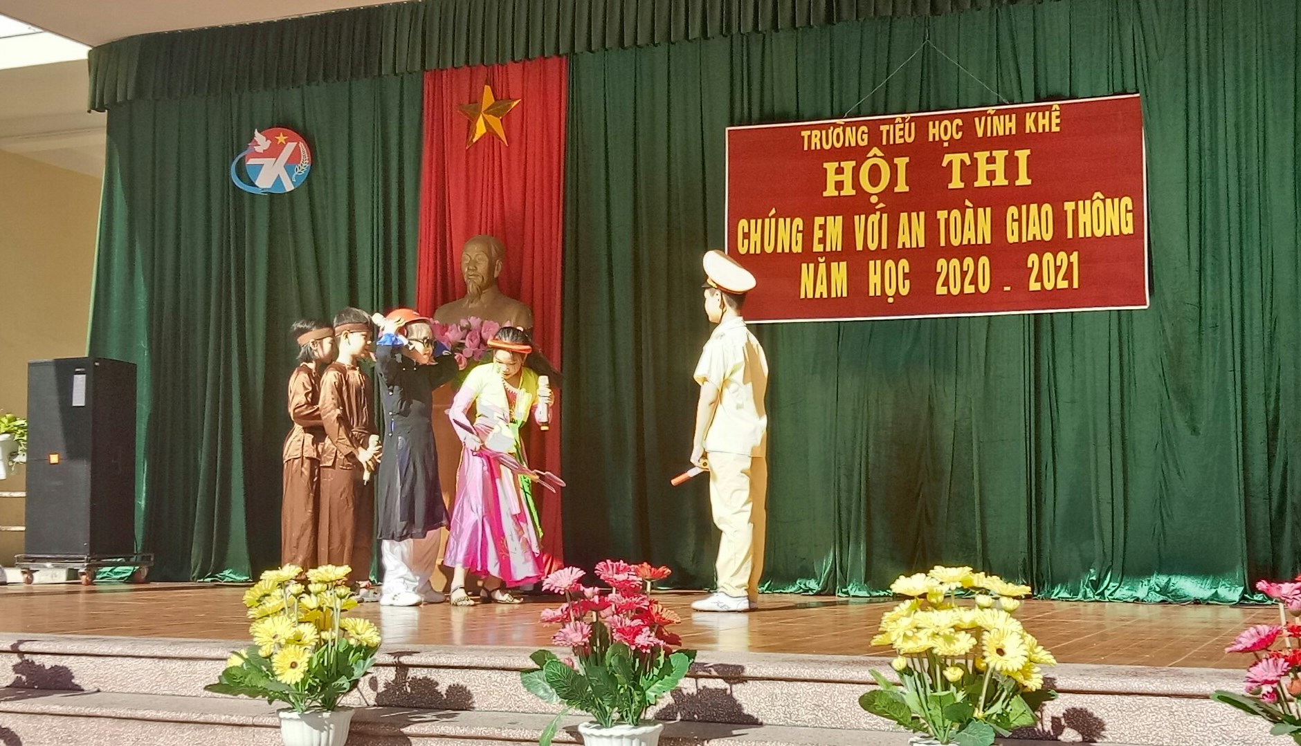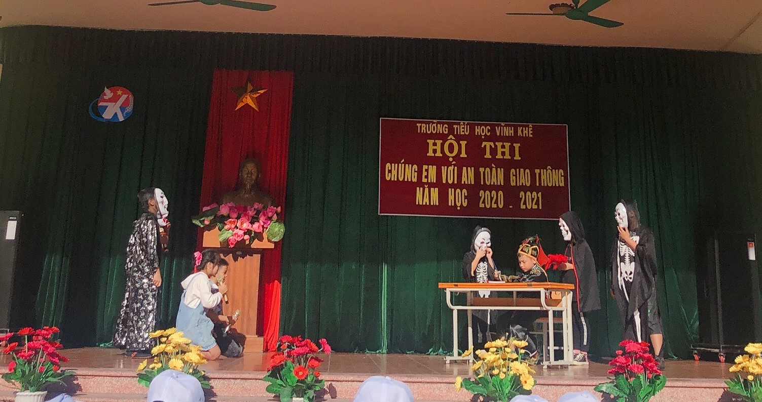 Sáng ngày 21/10 Liên đội trường Tiểu học Vĩnh Khê về việc tổ chức Hội thi chúng em với ATGT năm học 2020-2021. Hội thi có sự tham gia của 4 đội thi phần chào hỏi, tiểu phẩm tuyên truyền đến từ khối 4,5 và phần câu hỏi giao lưu thuộc lĩnh vực ATGT dành các khối 1,2,3.