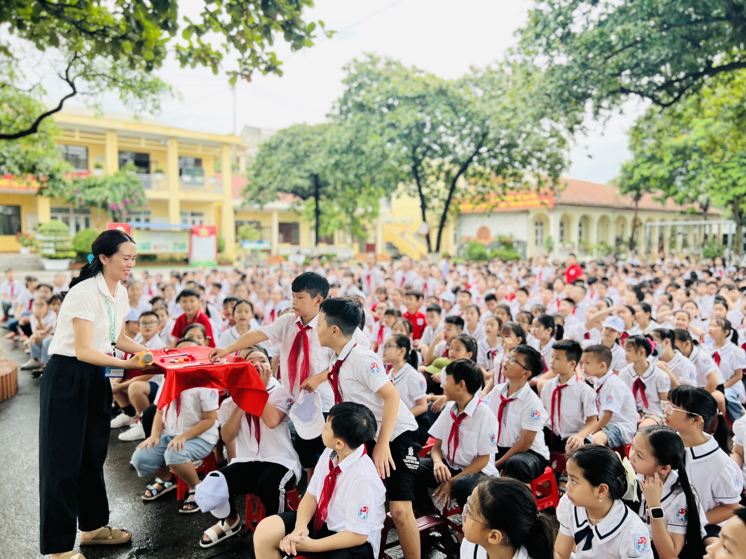 Liên đội trường Tiểu học Vĩnh Khê tổ chức sinh hoạt dưới cờ và giới thiệu lịch sử truyền thống nhà trường.