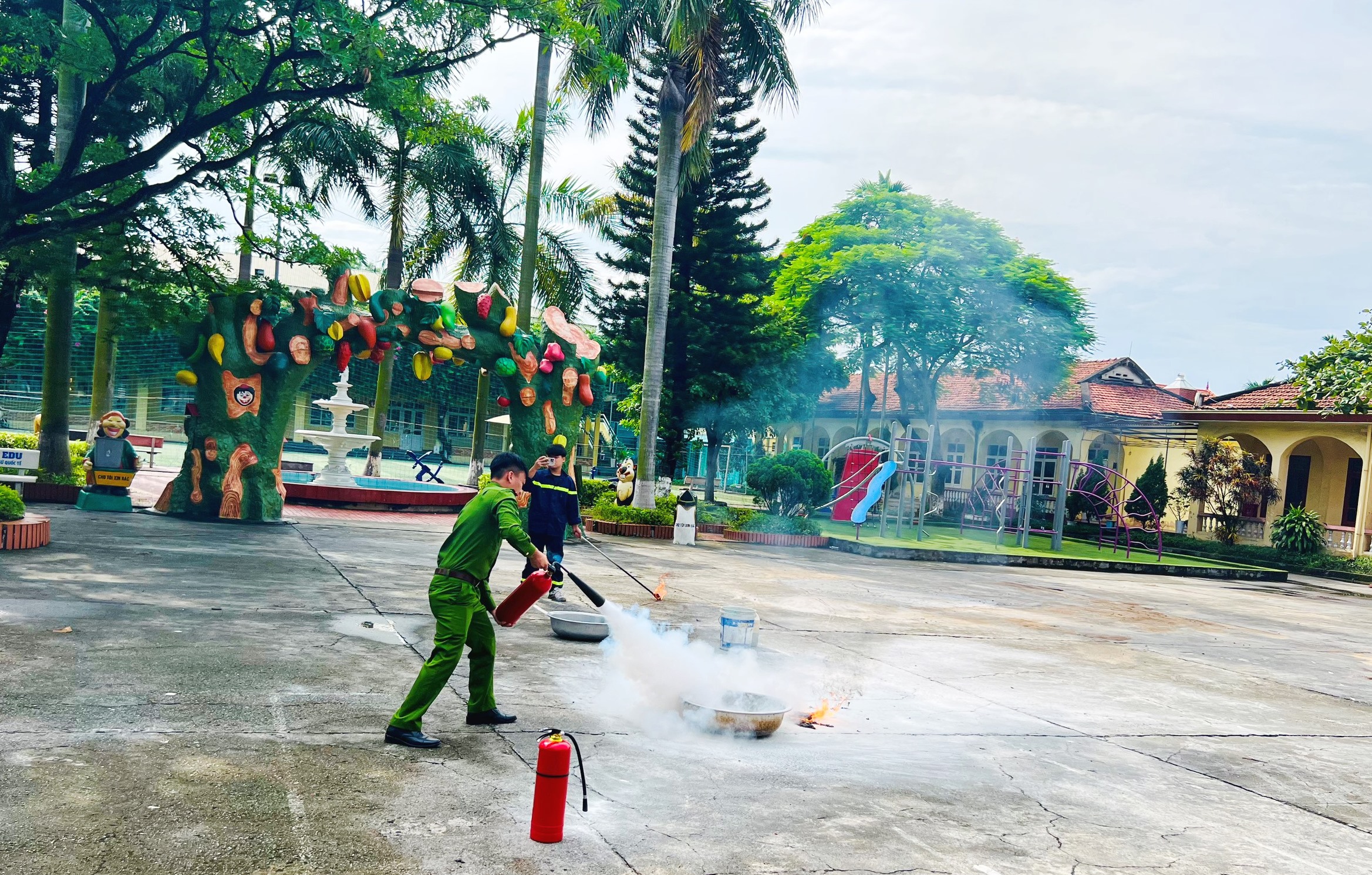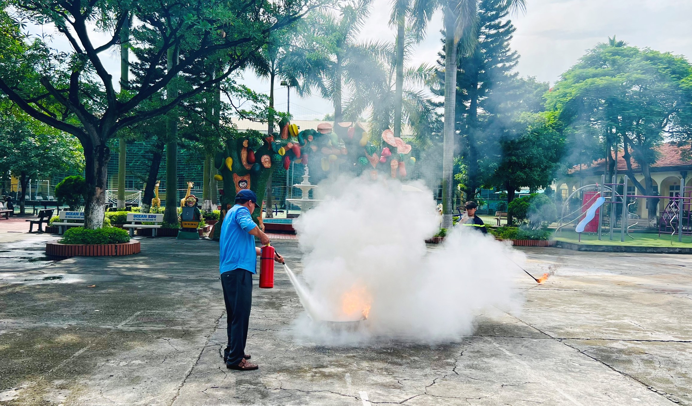Tập huấn nghiệp vụ phòng cháy, chữa cháy, diễn tập kỹ năng chữa cháy cho cán bộ, giáo viên, nhân viên, năm học 2023 – 2024.