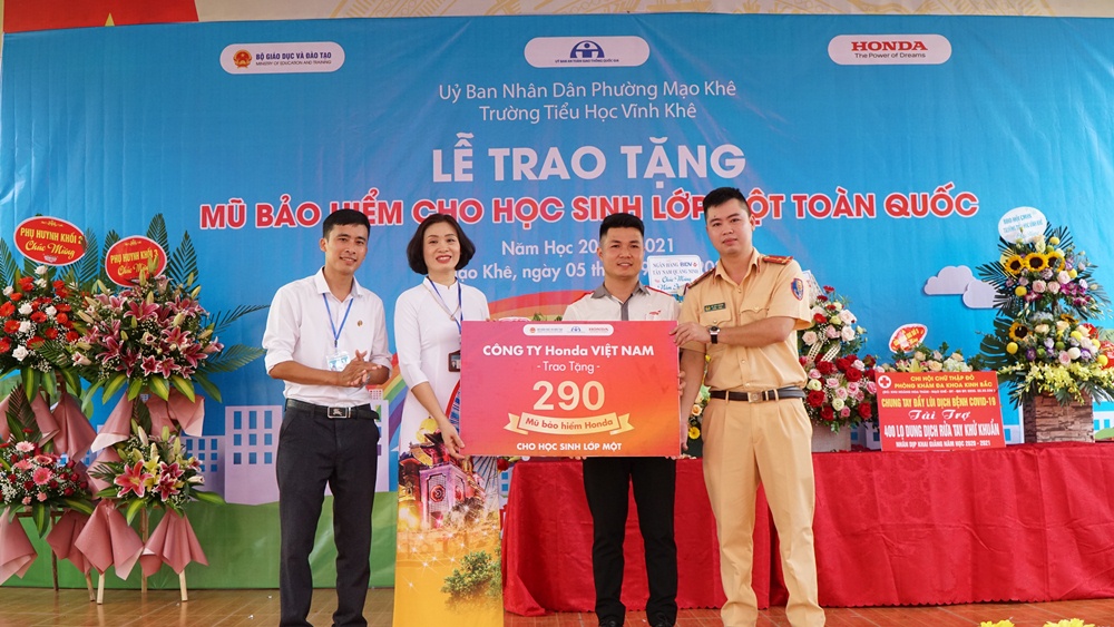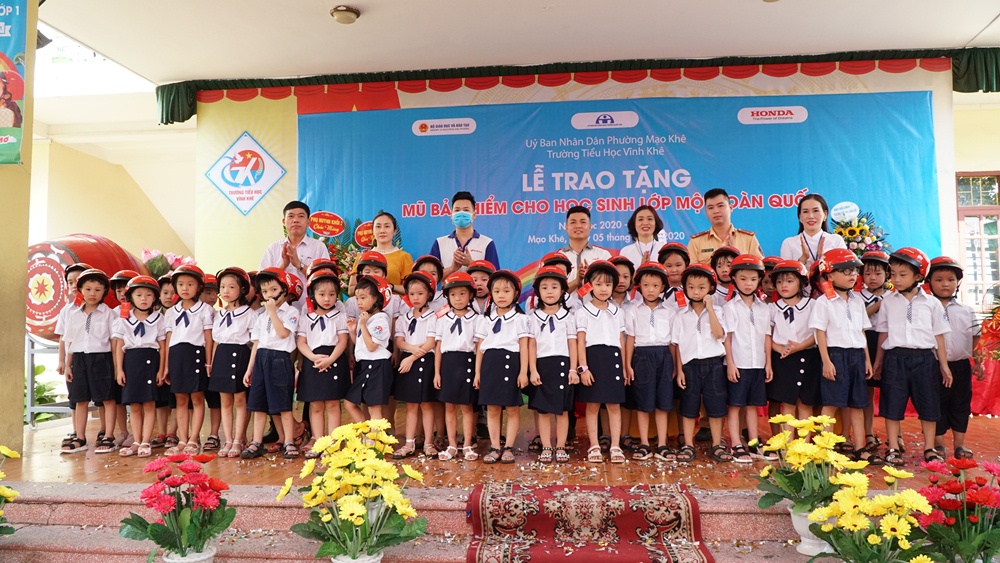 trao mũ bảo hiểm cho các em học sinh lớp 1