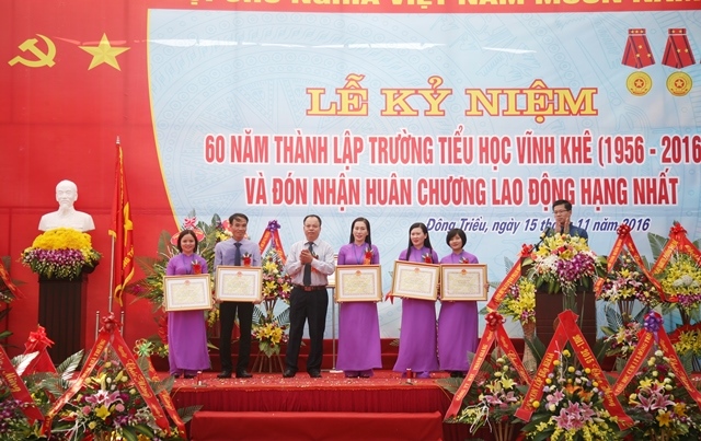 Ngày 14 và 15 tháng 11 năm 2016, trường Tiểu học Vĩnh Khê long trọng tổ chức Lễ kỷ niệm 60 năm ngày thành lập trường (1956 – 2016) và đón nhận Huân chương Lao động hạng Nhất. Về dự và chung vui với nhà trường có các đồng chí lãnh đạo văn phòng Trung ương Đảng, các đồng chí lãnh đạo của Tỉnh, Thị xã và đông đủ các thế hệ cán bộ, giáo viên, nhân viên và các thế hệ học sinh đã học tập, trưởng thành dưới mái trường.Trường Tiểu học Vĩnh Khê được thành lập năm 1956, tiền thân là trường cấp 1 Vĩnh Khê, Đến năm 1976 trường sát nhập với trường cấp 2 Vĩnh Khê thành PTCS Vĩnh Khê và được tách riêng khối tiểu học thành trường Tiểu học Vĩnh Khê từ năm 1996. Khi mới thành lập, trường chỉ có vài lớp học, vài chục học sinh ở các khu dân cư, cơ sở vật chất vô cùng thiếu thốn. Trải qua 60 năm xây dựng và trưởng thành, nhà trường đã không ngừng lớn mạnh cả về quy mô và chất lượng giáo dục, trở thành cánh chim đầu đàn của giáo dục tiểu học Quảng Ninh, là địa chỉ đỏ và là niềm tự hào đối với người dân Đông Triều.