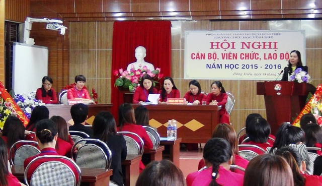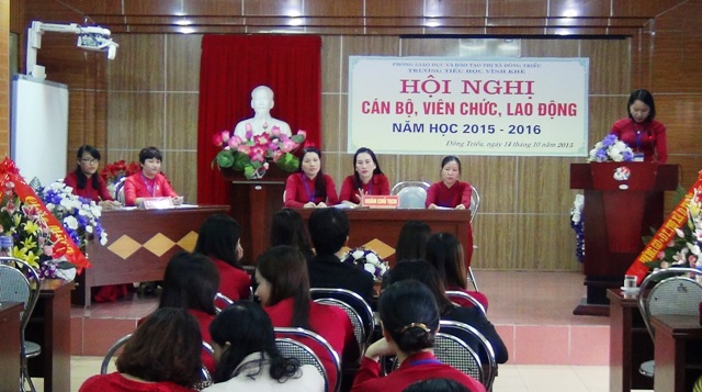 Thực hiện công văn số 644/LT PGD&ĐT-CĐGD về việc hướng dẫn và qui trình tổ chức Hội nghị cán bộ, công chức, viên chức lao động năm học 2015-2016 của phòng Giáo dục và Đào tạo thị xã Đông Triều, ngày 14/10/2015 trường Tiểu học Vĩnh Khê tổ chức Hội nghị cán bộ, viên chức, lao động năm học 2015-2016. Về dự và chỉ đạo Hội nghị có đồng chí Nguyễn Thị Hường- Phó trưởng phòng GD&ĐT thị xã Đông Triều và Ban đại diện cha mẹ học sinh nhà trường cùng 62 cán bộ, giáo viên, nhân viên trong nhà trường.Tại hội nghị, đồng chí Lê Thị Thu- Hiệu trưởng nhà trường đã tổng kết, đánh giá kết quả việc thực hiện nhiệm vụ trong năm học 2014 - 2015 và thông qua các chỉ tiêu, giải pháp thực hiện nhiệm vụ trong năm học 2015 - 2016. Bản dự thảo phương hướng đã nêu các nhiệm vụ trọng tâm của nhà trường trong năm học mới, các yêu cầu và giải pháp cụ thể để hoàn thành tốt nhiệm vụ năm học như: Thực hiện có hiệu quả các cuộc vận động, các phong trào thi đua của ngành, của địa phương; tiếp tục nâng cao hiệu quả công tác quản lý; nâng cao chất lượng và hiệu quả hoạt động giáo dục; tập trung phát triển đội ngũ nhà giáo và cán bộ quản lý, tiếp tục đổi mới mạnh mẽ phương pháp dạy học, kiểm tra, đánh giá; … đẩy mạnh có hiệu quả các hoạt động giáo dục trong năm tới, phấn đấu đề nghị Chủ tịch nước tặng thưởng Huân chương Lao động hạng Nhất.