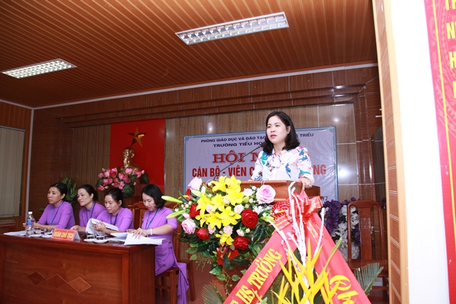 Tại hội nghị, đồng chí Lê Thị Thu - Bí thư chi bộ - Hiệu trưởng nhà trường báo cáo kết quả thực hiện nhiệm vụ năm học 2016-2017 và phương hướng, nhiệm vụ, chỉ tiêu thi đua của nhà trường trong năm học 2017-2018.
