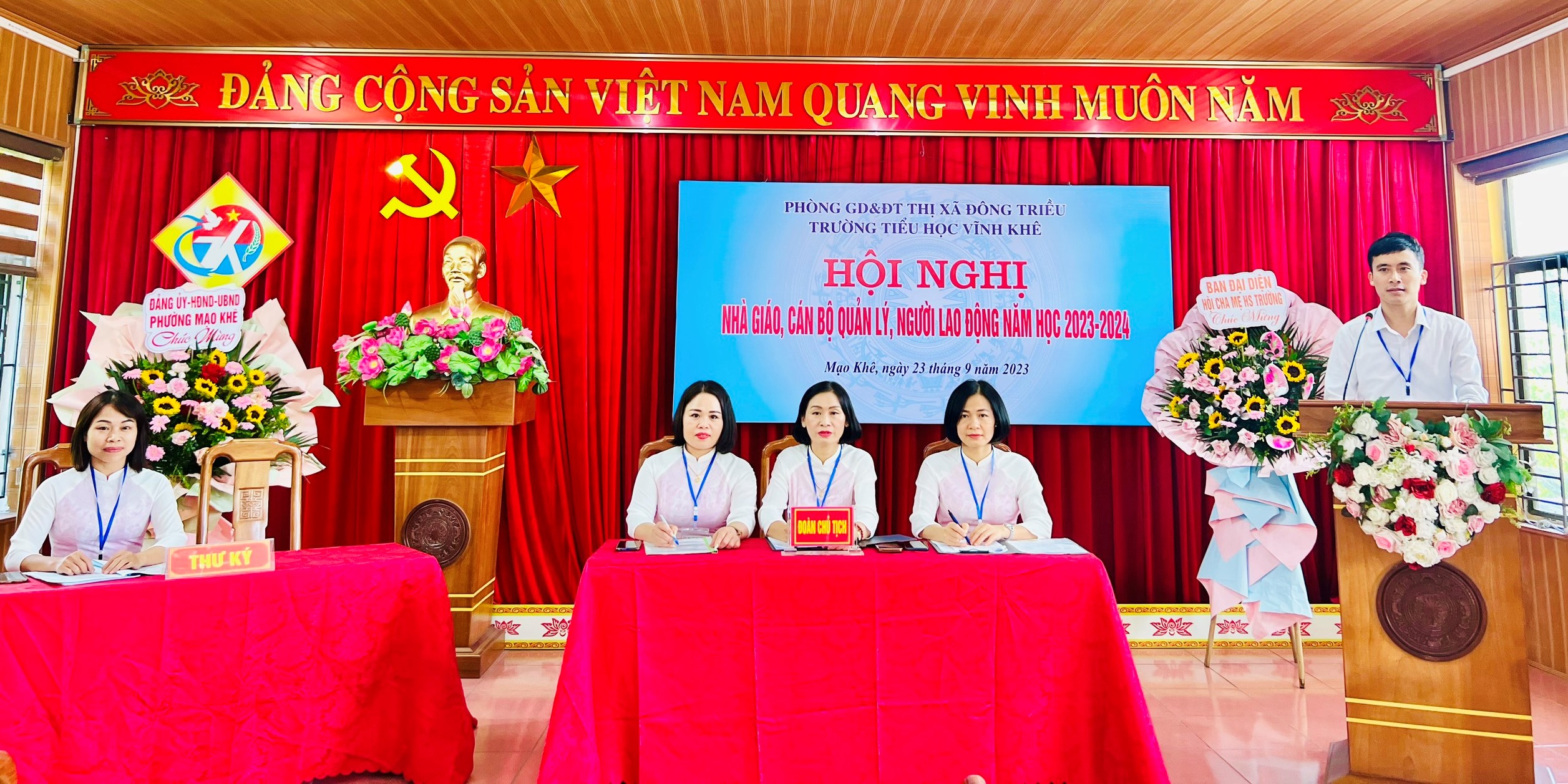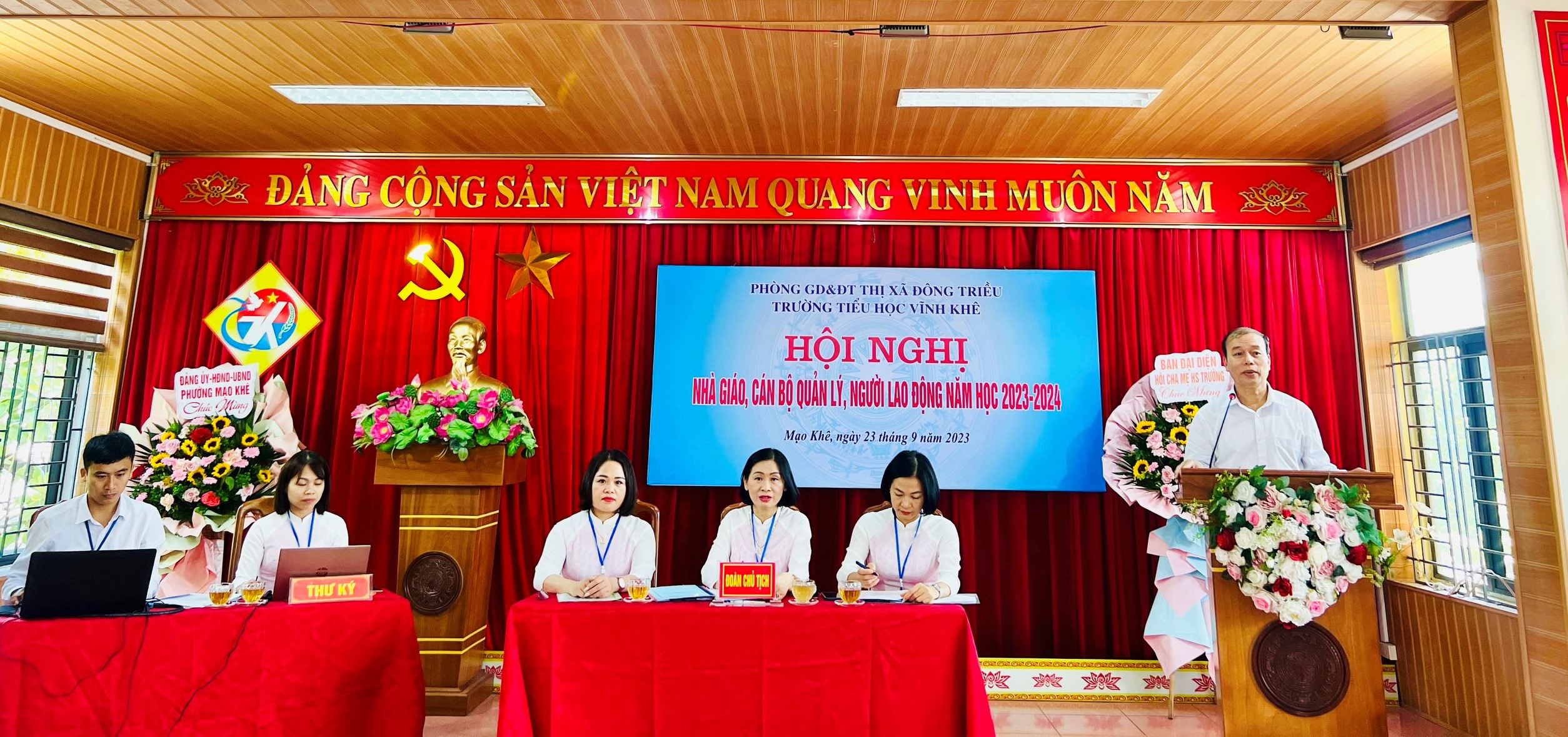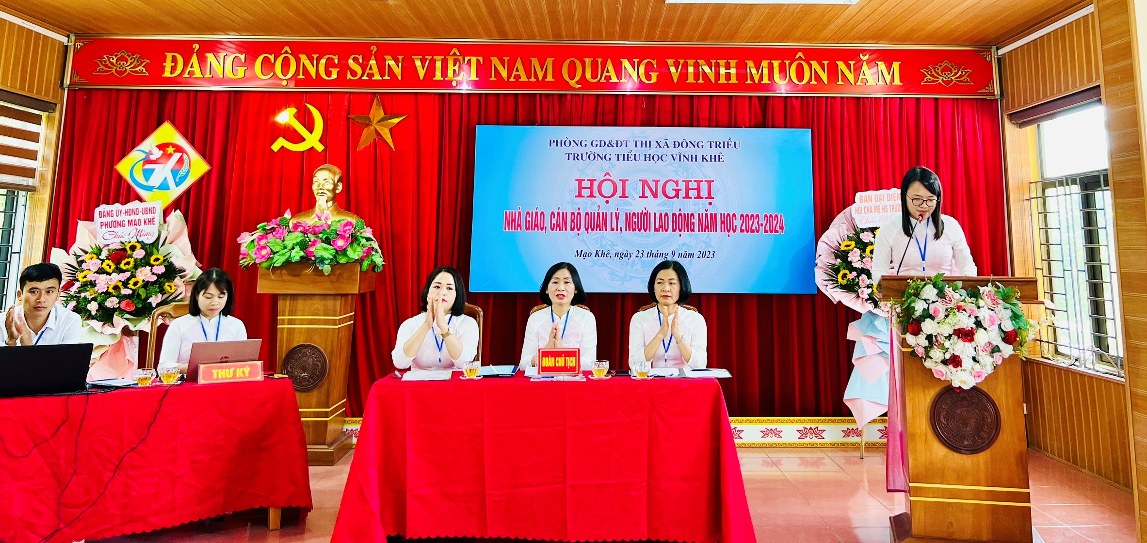 Thực hiện Hướng dẫn số 1454/HDLN - GD ĐT –LĐLĐ ngày 12/9/2023 của Phòng GD&ĐT thị xã Đông Triều , Liên đoàn Lao động thị xã Đông Triều về việc tổ chức Hội nghị nhà giáo, cán bộ quản lý, người lao động năm học 2023-2024, sáng ngày 23/9/2023, trường Tiểu học Vĩnh Khê tổ chức Hội nghị nhà giáo, cán bộ quản lý, người lao động năm học 2023-2024.