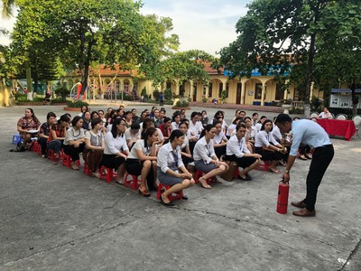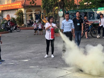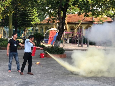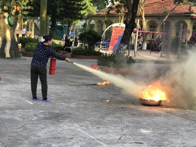 Ngoài ra, các cán bộ, giáo viên, nhân viên đã được thực hành cách sử dụng các phương tiện bình bột, bình CO2 để dập tắt đám cháy và cách thức xử lý nhanh các tình huống có thể xảy ra. Cách sử dụng khăn, vải… để khóa van bình ga đang cháy.