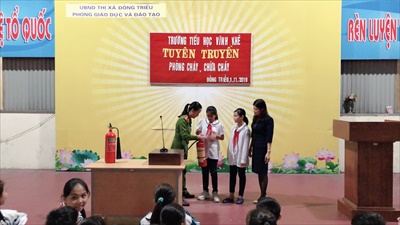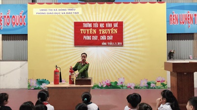 Thực hiện Công văn số 954/PGD&ĐT thị xã Đông Triều v/v phối hợp tổ chức các hoạt động tuyên truyền PCCC và CNCH cơ sở giáo dục trên địa bàn thị xã năm 2019, chiều ngày 31/10/2019 Trường Tiểu học Vĩnh Khê đã phối hợp với Phòng Cảnh sát PCCC và CNCH - Công an thị xã Đông Triều tổ chức tuyên truyền ngoại khóa về công tác phòng cháy, chữa cháy cho toàn thể CB, GV, NV và hơn 1.500 em học sinh.Tại buổi tuyên truyền, toàn thể CB, GV, NV và học sinh nhà trường đã được nghe phổ biến những nội dung cơ bản về pháp luật phòng cháy, chữa cháy và quy trình xử lý khi có cháy, nổ xảy ra; kỹ năng thoát nạn trong điều kiện cháy. Đồng thời hướng dẫn các em học sinh cách sử dụng, bảo quản, quản lý bình chữa cháy và hướng dẫn an toàn khi sử dụng điện, gas cho học sinh và đặc biệt là cách thoát nạn khi có cháy xảy ra dưới sự hướng dẫn của cán bộ đội PCCC Công an thị xã.