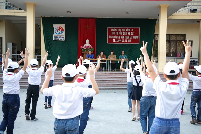 Kỷ niệm 72 năm ngày Thành lập Quân đội nhân dân Việt Nam (22/12/1944-22/12/2016) và 26 năm ngày Hội quốc phòng toàn dân (22/12/1989- 22/12/2016), trường Tiểu học Vĩnh Khê tưng bừng tổ chức hội thi đồng diễn thể dục giữa các lớp trong toàn trường.Nằm trong chuỗi các hoạt động chào mừng ngày Thành lập Quân đội nhân dân Việt Nam và ngày Hội quốc phòng toàn dân, không chỉ thi đua dạy tốt học tốt mà còn giáo dục tất cả các em học tập tác phong anh bộ đội Cụ Hồ, ngày 21 - 22/12 nhà trường đã tổ chức hội thi đồng diễn thể dục cho học sinh toàn trường. Tại hội thi, học sinh các lớp đều được hóa thân thành những "chiến sĩ nhí" qua bài đồng diễn thể dục khỏe khoắn, năng động. Từ tác phong xếp hàng nhanh nhẹn, khẩn trương đến tinh thần ý thức kỉ luật trong hàng ngũ đều được các em thể hiện tốt.