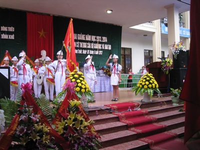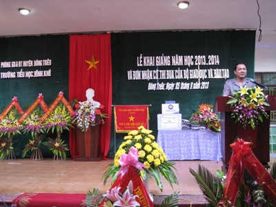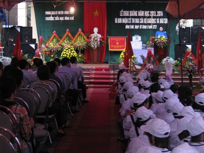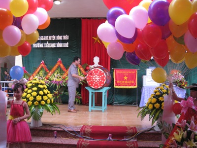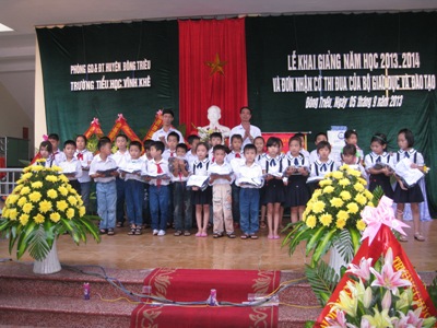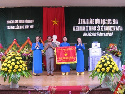 Sáng nay, ngày 05 tháng 9 năm 2013, thầy và trò Trường Tiểu học Vĩnh Khê đã long trọng tổ chức Lễ khai giảng năm học 2013-2014 và đón nhận Cờ thi đua của Bộ Giáo dục và Đào tạo trao tặng đơn vị Tiêu biểu Xuất sắc.Tại buổi lễ, nhà trường vinh dự được đón tiếp đồng chí Vũ Văn Học – Phó Bí thư huyện ủy – Chủ tịch Ủy ban nhân dân huyện, đồng chí Vũ Thị Thúy Hà – Trưởng phòng Giáo dục Tiểu học - Sở giáo dục và Đào tạo, đồng chí Nguyễn Thu Hường – Phó Trưởng phòng Giáo dục và Đào tạo, đồng chí Vũ Văn Hồng – Chủ tịch Hội đồng nhân dân thị trấn Mạo Khê, đại biểu các ban, ngành, đoàn thể, các đơn vị và đông đảo các bậc phụ huynh đã về dự chung vui với nhà trường.