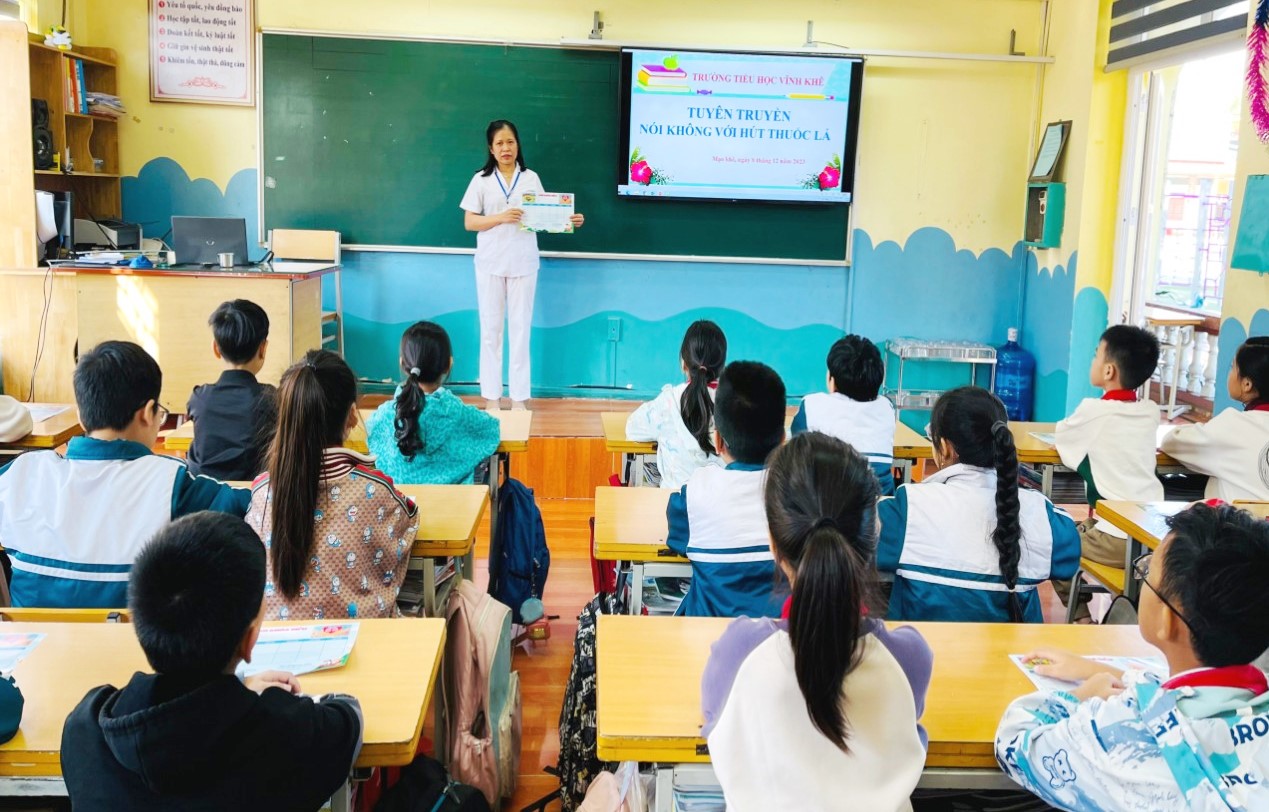 Thực hiện kế hoạch triển khai công tác y tế năm học 2023-2024, sáng ngày 08/12/2023 trường Tiểu học Vĩnh Khê tổ chức chương trình tuyên truyền phòng chống tác hại thuốc lá trong lớp học.Nhân viên y tế: Nguyễn Thị Hoài truyền đạt trực tiếp những kiến thức về tác hại của việc hút thuốc lá tại lớp 4D3