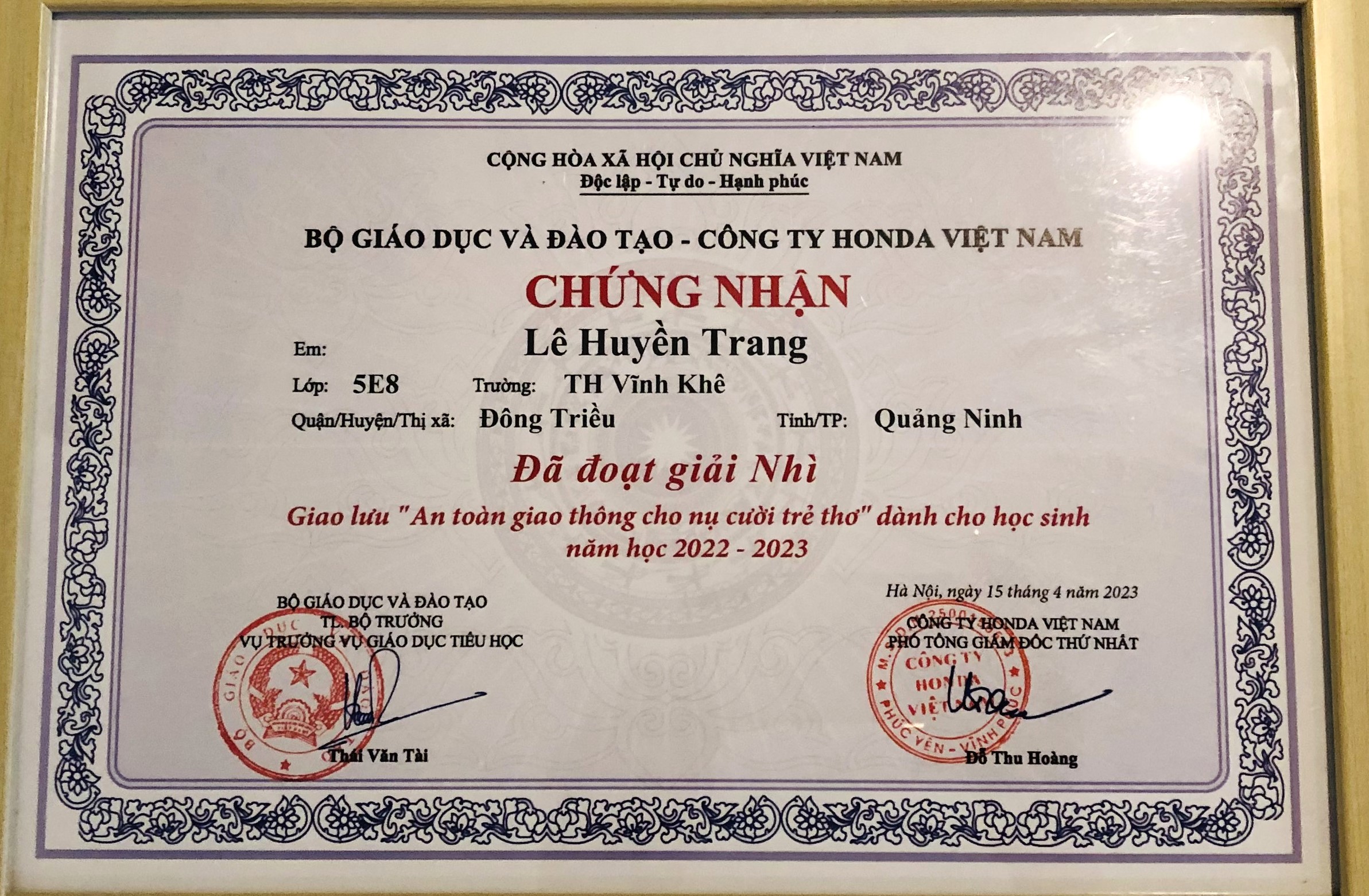 Em Lê Huyền Trang – học sinh lớp 5E8 trường Tiểu học Vĩnh Khê là một trong 27 học sinh tiêu biểu của cả nước đã xuất sắc đạt giải Nhì. Cuộc thi tìm hiểu "An toàn giao thông cho nụ cười trẻ thơ" năm học 2022 – 2023 dành cho giáo viên, học sinh tiểu học đã được phát động từ tháng 12/2022 và kéo dài đến tháng 3/2023 theo hình thức trắc nghiệm và tự luận.