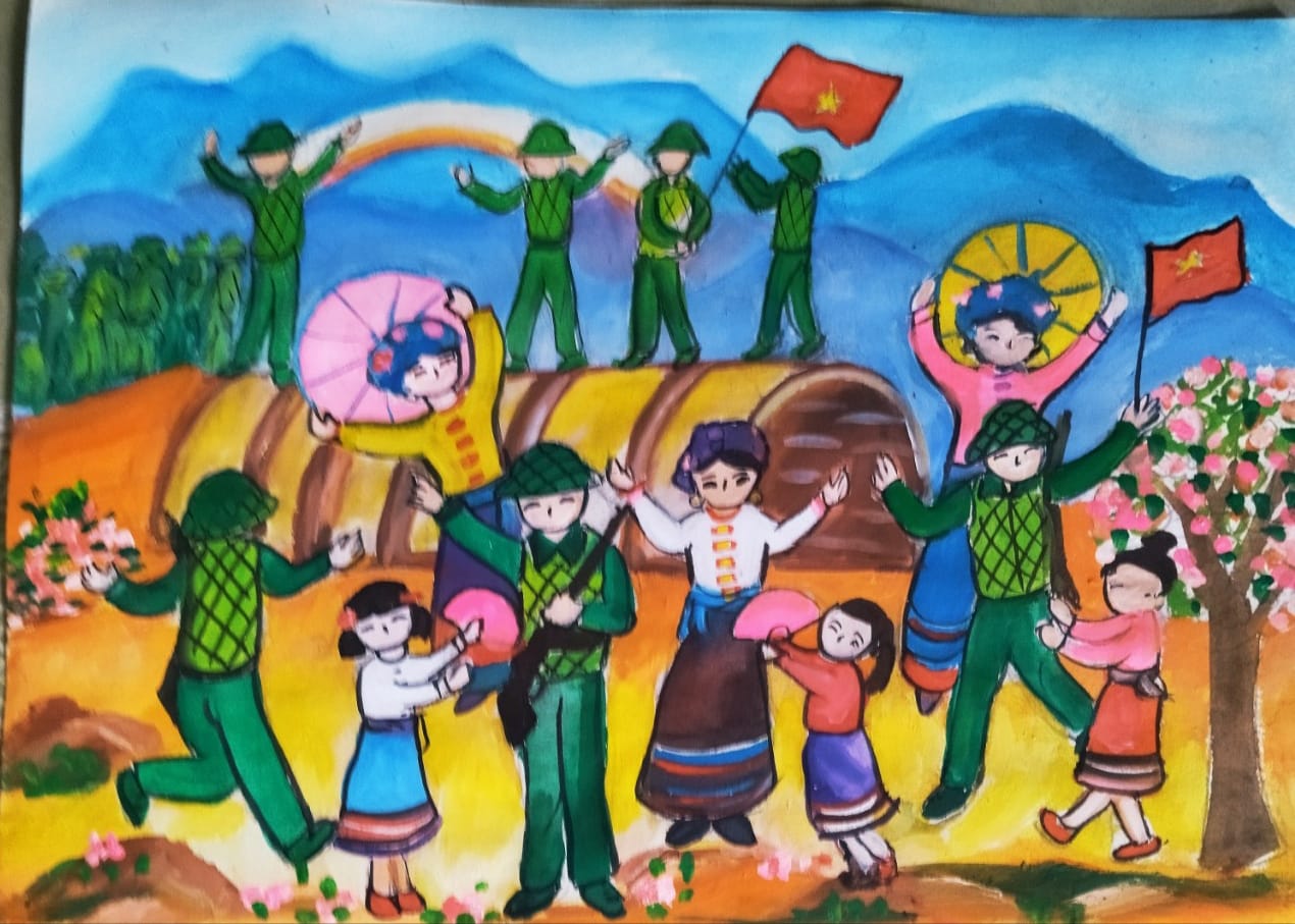 Bức tranh của em Nguyễn Tuệ Linh - 5E7 đạt giải Ba Cuộc thi "Vẽ tranh của thiếu niên, nhi đồng về Chiến thắng Điện Biên phủ và hình ảnh Điện Biên phủ hôm nay" nhân dịp kỉ niệm 70 năm chiến thắng lịch sử Điện Biên Phủ (07/05/1954-07/05/2024)
