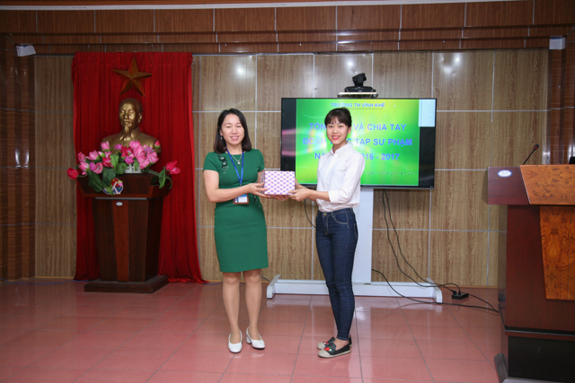Thay mặt đoàn thực tập ĐHSP Hạ Long, em Phạm Thị Huyền phát biểu cảm ơn nhà trường đã tạo môi trường thuận lợi, giúp đỡ cho các sinh viên trong thời gian thực tập kéo dài hơn 1 tháng tại trường. Các em đã tích lũy được cho mình khá nhiều kinh nghiệm giảng dạy và công tác chủ nhiệm để trở thành những giáo viên trẻ tương lai tiếp bước các thế hệ thầy cô làm tốt nhiệm vụ trồng người.