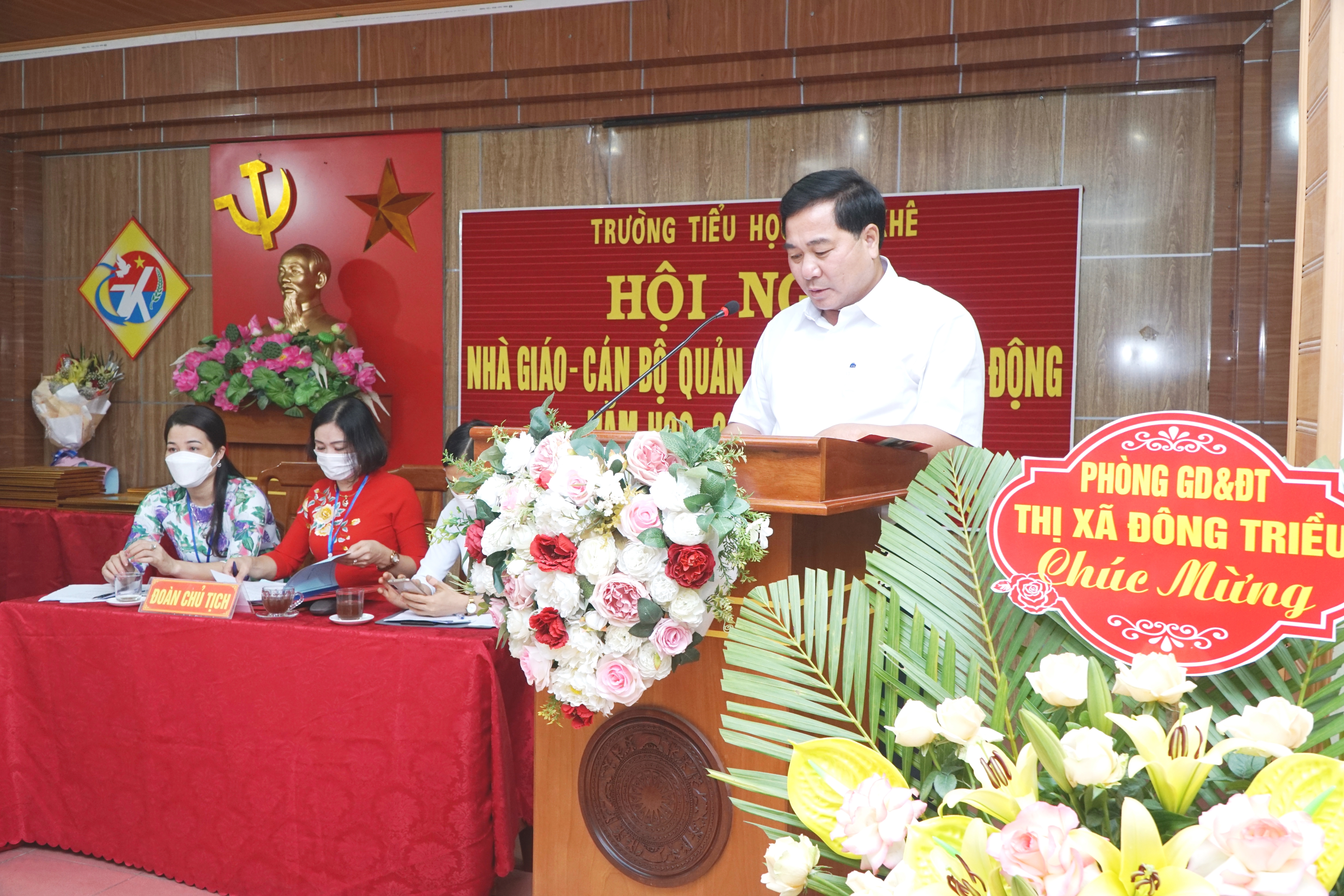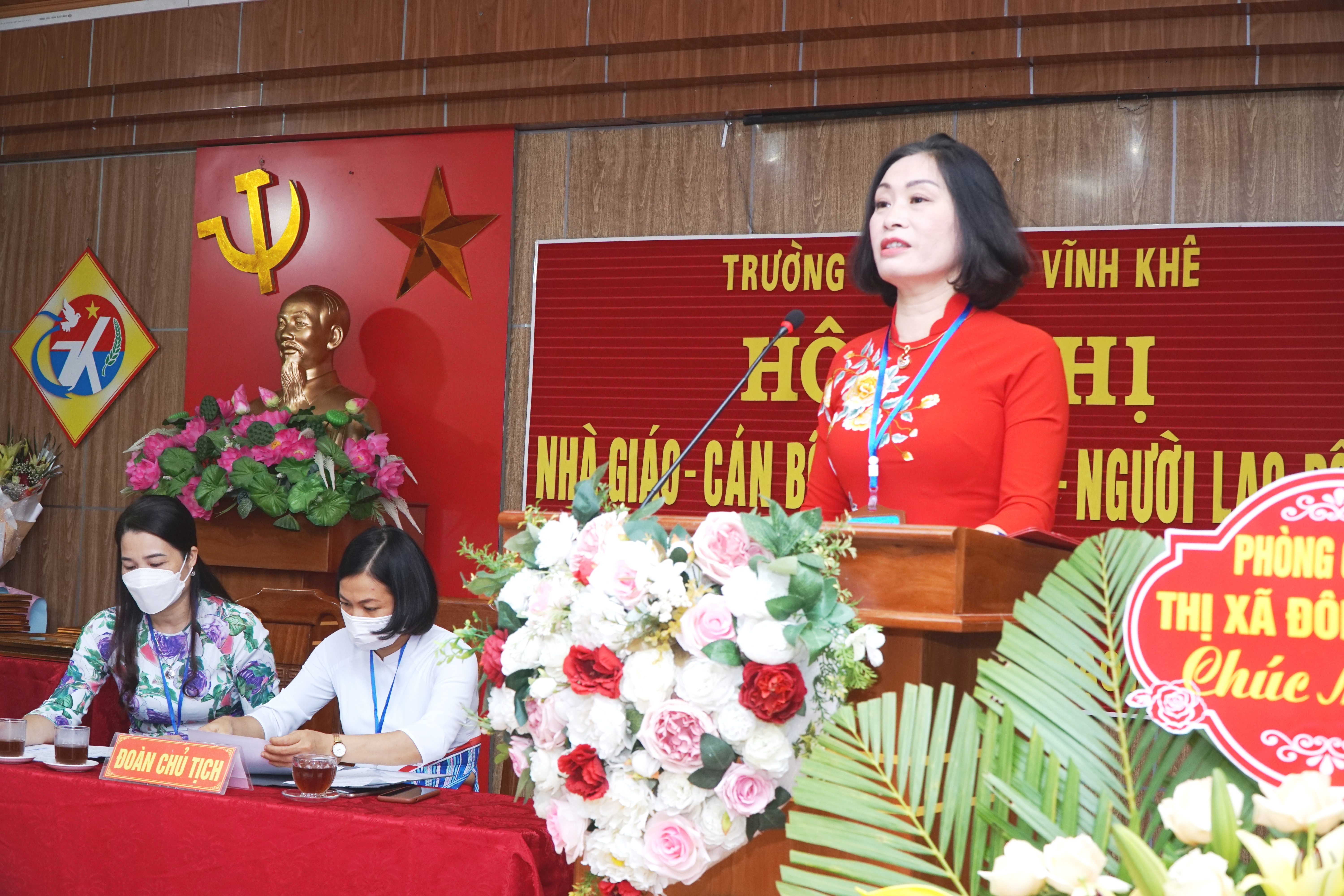 Tới dự và chỉ đạo hội nghị có ông: Vũ Đức Quynh – Đảng ủy viên – Phó Chủ tịch UBND phường Mạo Khê, bà Đinh Thị Kim Cúc – phụ trách chuyên môn Phòng GD&ĐT thị xã Đông Triều, đại diện Hội cha mẹ học sinh và toàn thể CB,GV,NV nhà trường . Tại Hội nghị Bà Phạm Thị Nguyệt  - Bí thư chi bộ - Hiệu trưởng nhà trường thay mặt Đoàn Chủ tịch đã trình bày báo cáo tống kết năm học 2020-2021 và phương hướng, chỉ tiêu, biện pháp thực hiện các nhiệm vụ năm học 2021-2022 với phương hướng chung: Thực hiện tốt mục tiêu kép phòng, chống dịch Covid-19, bảo đảm trường học an toàn và nâng cao chất lượng giáo dục, thực hiện chương trình giáo dục theo định hướng phát triển phẩm chất và năng lực của học sinh, tăng cường giáo dục đạo đức, lối sống, kỹ năng sống, sức khoẻ cho học sinh.