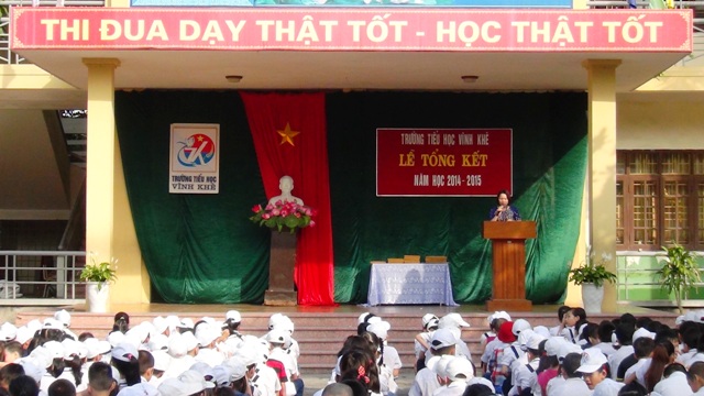 Tại buổi lễ, đồng chí Lê Thị Thu - Bí thư chi bộ, Hiệu trưởng nhà trường đã tổng kết, đánh giá những kết quả của thầy và trò đã đạt được trong năm học vừa qua. Với sự nỗ lực bền bỉ của thầy và trò cùng với sự quan tâm giúp đỡ kịp thời, tạo điều kiện của Hội Cha mẹ học sinh, năm học 2014 – 2015 trường Tiểu học Vĩnh Khê đã đạt được rất nhiều thành tích đáng khích lệ.